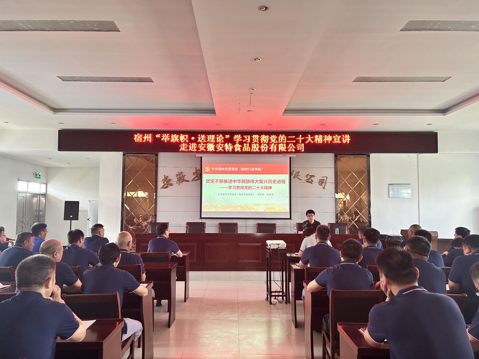 8月11日下午,宿州“舉旗幟·送理論”學習貫徹黨的二十大精神基層宣講報告會在安徽安特食品股份有限公司電教室召開。市委黨校理論研究室主任、副教授竇祥銘作專題宣講,市經(jīng)開區(qū)四級調(diào)研員、非公黨委副書記王浩主持會議。